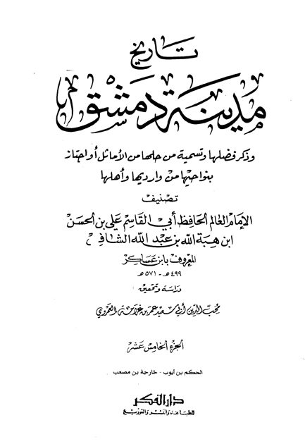 تاريخ مدينة دمشق وذكر فضلها وتسمية من حلها من الأماثل أو اجتاز بنواحيها من وارديها وأهلها لحافظ الدنيا: علي بن الحسن بن هبة الله بن عبد الله الشافعي المعروف بابن عساكر (499 – 571 هـ)