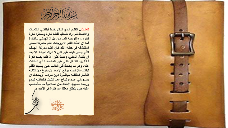 القلم الذي كان يخط فينتقي الكلمات والالفاظ ثم اراه شاطبا تارة وسطرا تارة اخرى والتوجيه انما من الله